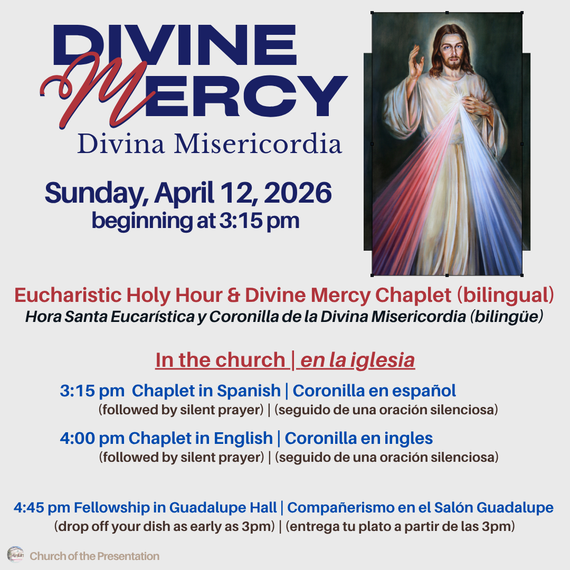 The Sunday, 10:30 AM and 2:15 PM (Spanish) Masses and the 12:15 PM Daily Masses on Monday, Wednesday, and Friday, will be livestreamed on our Facebook page and on our YouTube channel.