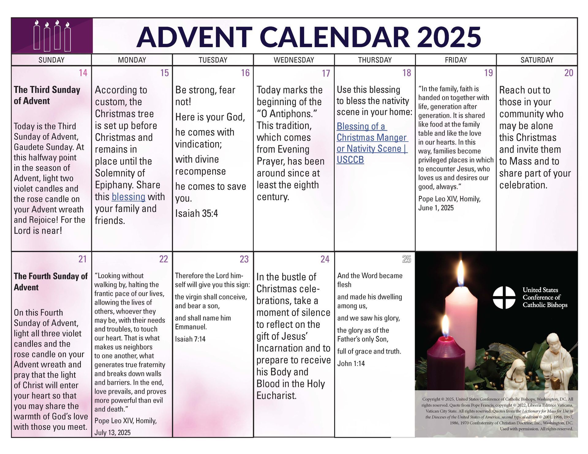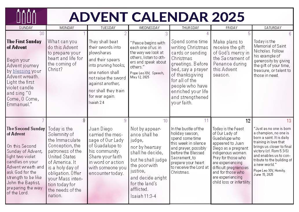 - Small Group Reflection Guide: This weekly guide features Advent readings, reflections from Pope Leo XIV, and questions for sharing and listening. Click here for guide.