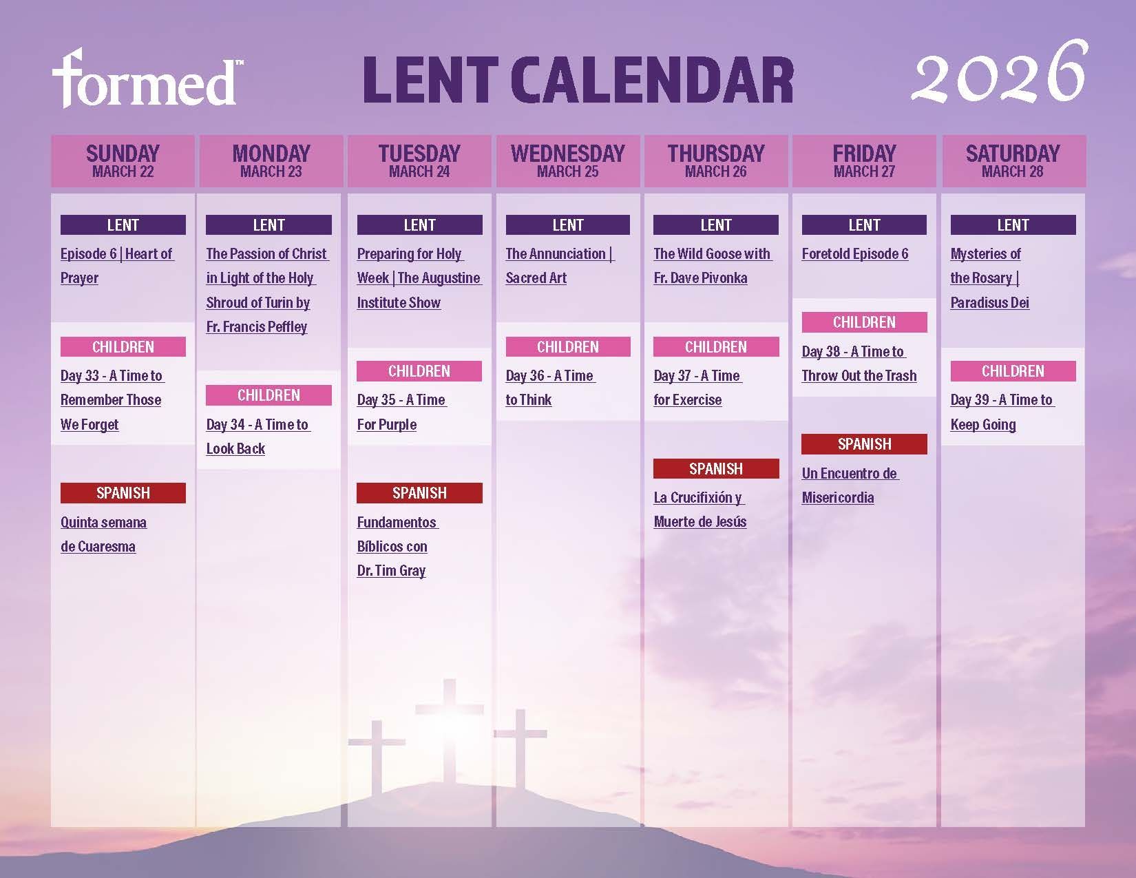 A menudo, el pilar más olvidado de la Cuaresma es la oración. Hay muchísimas maneras maravillosas de orar durante la Cuaresma. Dedicar más tiempo a la oración durante la Cuaresma nos acercará más al Señor y nos permitirá encontrarnos con él. Podemos orar especialmente por la gracia de vivir nuestras promesas bautismales más plenamente. Podemos orar por los elegidos que serán bautizados en Pascua y apoyar su camino de conversión con nuestra oración. Podemos orar por todos aquellos que celebrarán el sacramento de la reconciliación con nosotros durante la Cuaresma, para que se renueven verdaderamente en su compromiso bautismal.