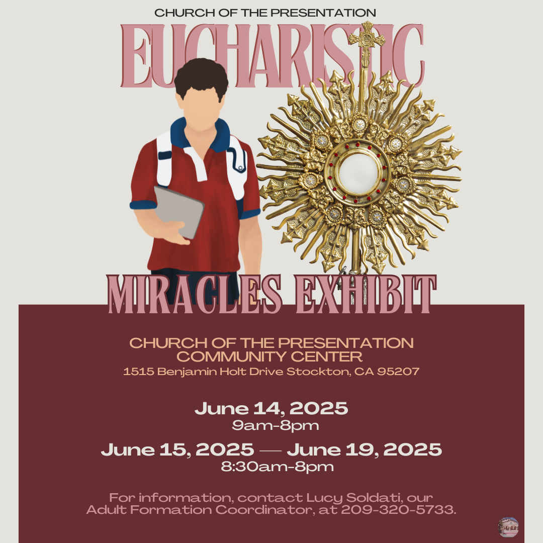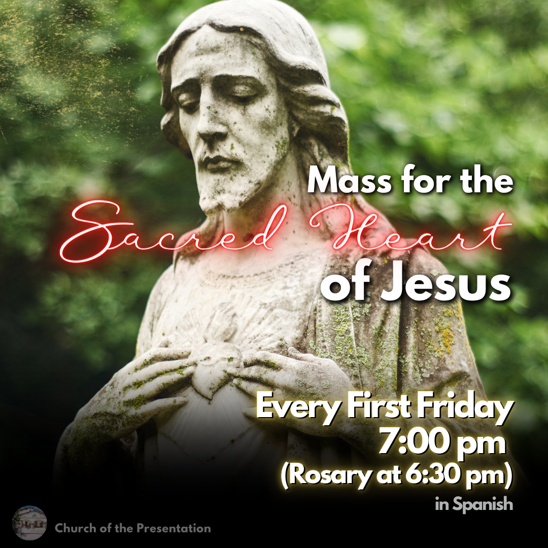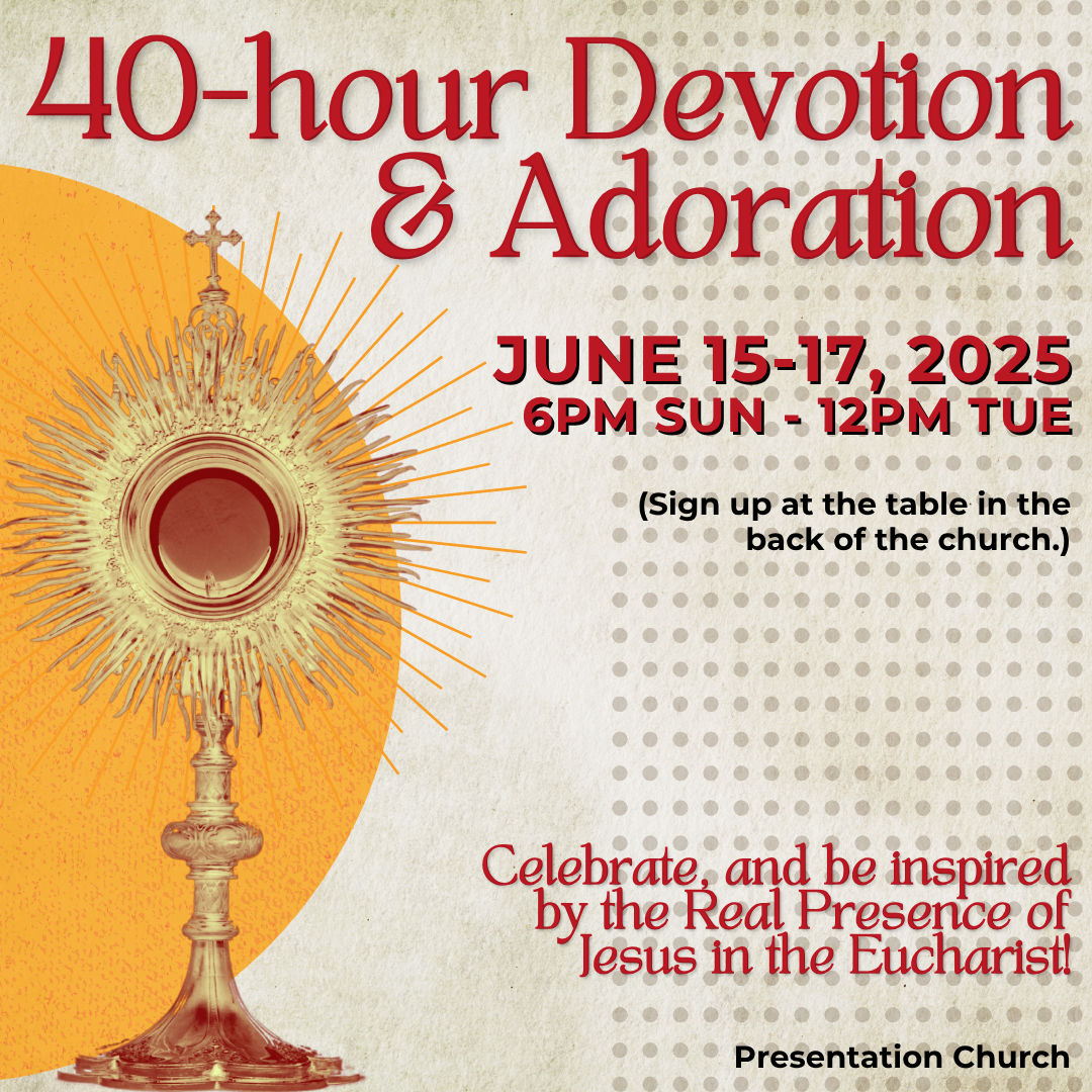 Of course, we know that Jesus remains with us on Earth in the Blessed Sacrament, which is the everlasting token of his love, and which is his very self. Jesus left us his precious Body and Blood as “a memorial of his death and Resurrection.” At every Mass, Jesus gives us the love of his Heart, which has suffered so greatly for us! This month, we will prepare for the great Feast of the Body and Blood of the Lord (June 21) by having an entire week of events related to the Eucharist here at Presentation BVM Parish. We will once again host the “Eucharistic Miracles Exhibit” in our Community Center (June 13-19). There will be “Forty Hours” of Adoration of the Blessed Sacrament exposed in the monstrance day and night in our church (June 15-17). All this will prepare us for a grand “Corpus Christi Procession” through the streets of our neighborhood. We will publicly show our love for Jesus with this solemn parade and will honor him with songs, prayers, and flower petals in the street! (Saturday, June 20). The following Friday is the Feast of the Sacred Heart of Jesus, which we will celebrate with a bilingual Mass (June 27).