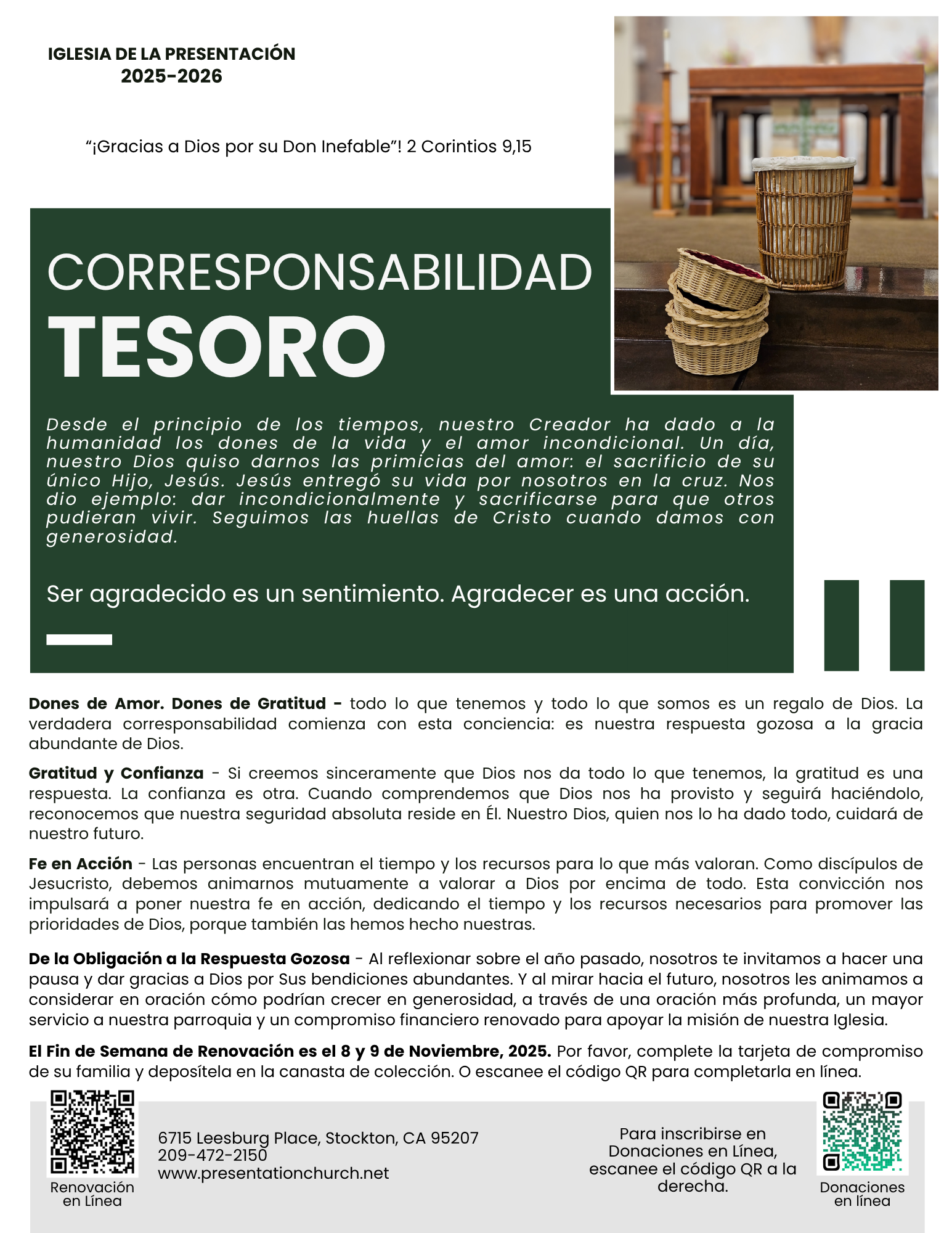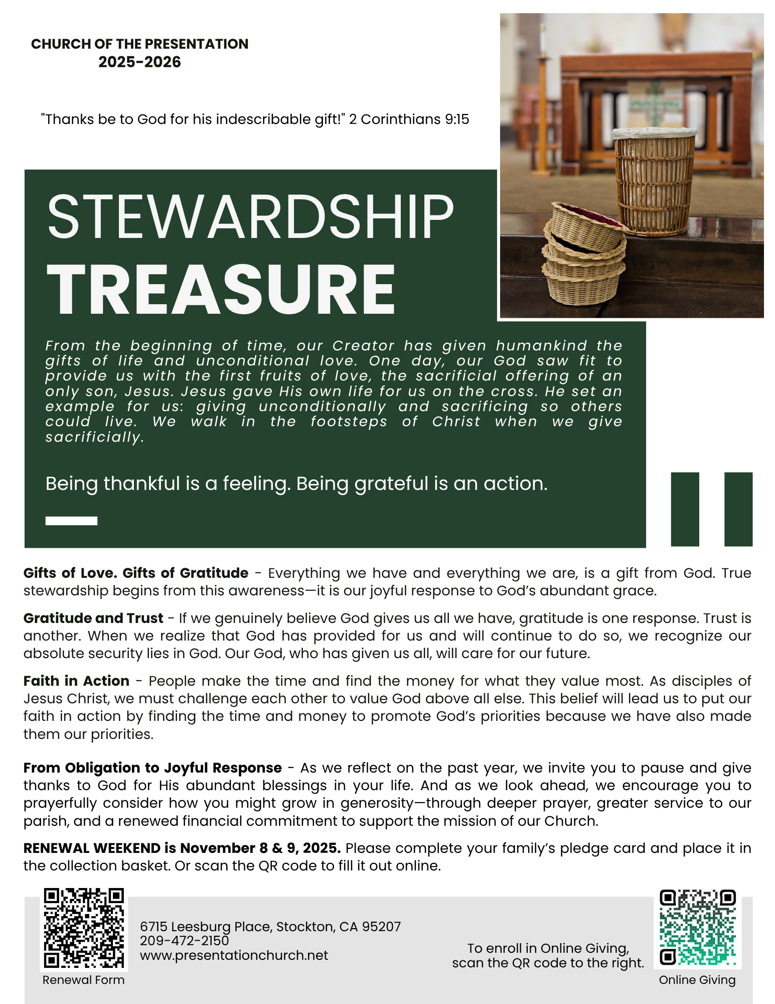 Our entire life is meant to be a response to the goodness of God. Stewardship is our response to the abundant generosity of God to us. A Steward is the Servant of All. A grateful and generous heart is the fruit of prayer, participation, and generosity. As faithful stewards, we are invited to recognize that everything we have—our time, our talents, and our treasure—is a gift from God. Stewardship is not just about giving; it is about living a life of gratitude and discipleship, offering ourselves in love and service to God and neighbor.